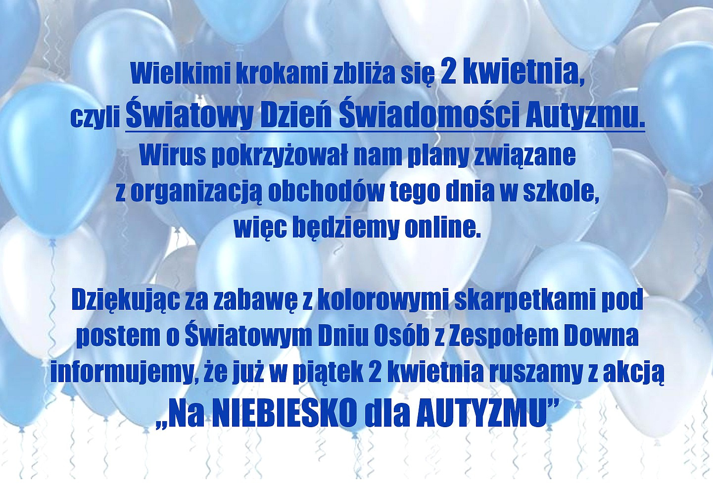 Dziękując za zabawę z kolorowymi skarpetkami pod postem o Światowym Dniu Osób z Zespołem Downa informujemy, że już w piątek 2 kwietnia ruszamy z akcją „Na NIEBIESKO dla AUTYZMU”.