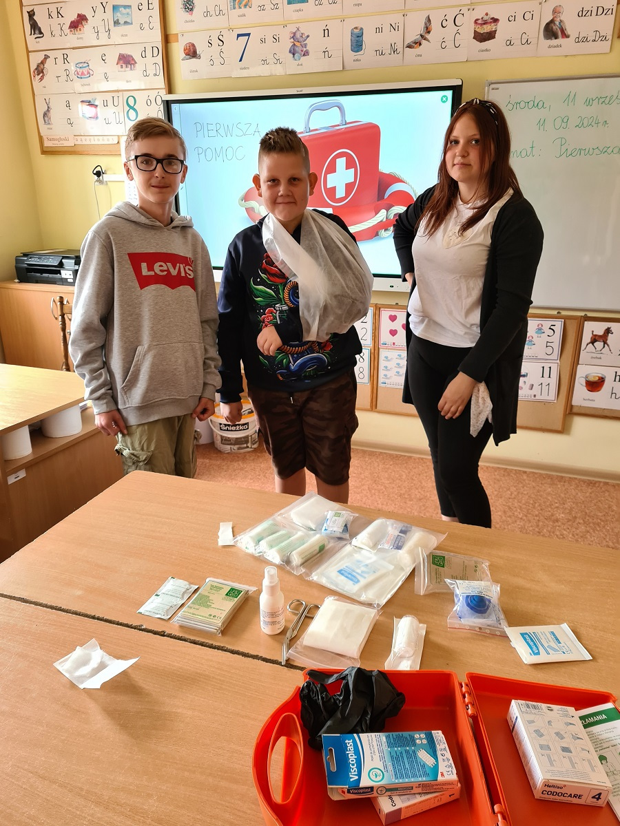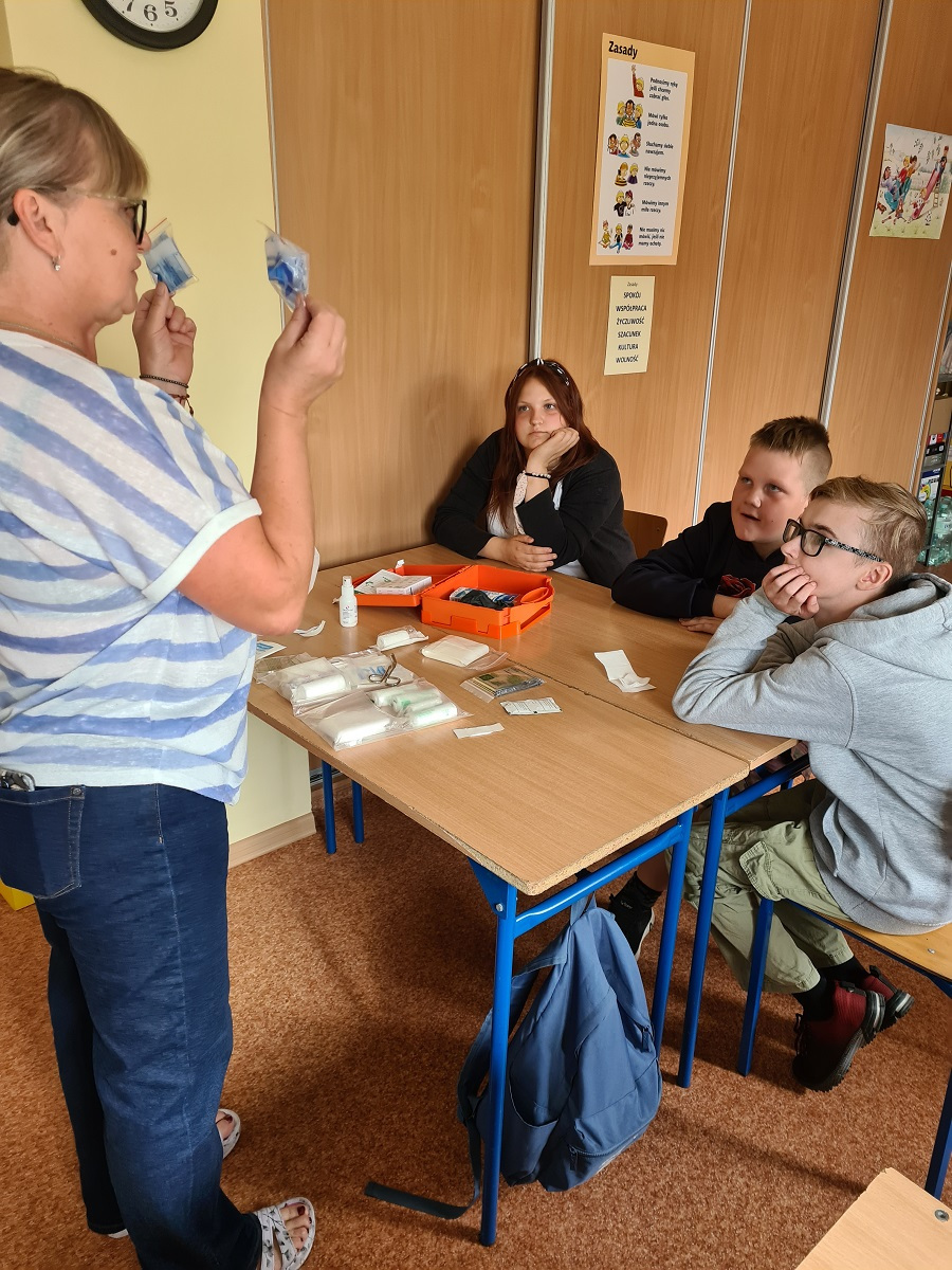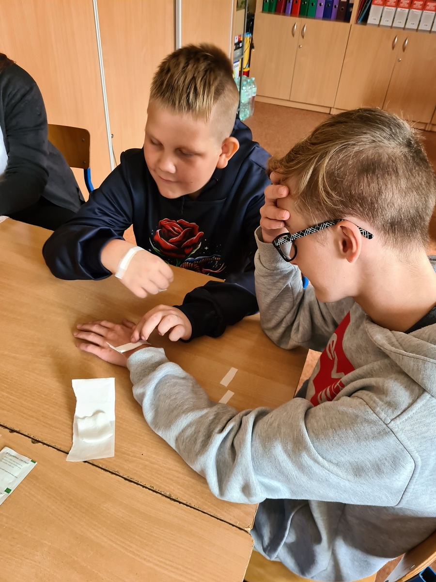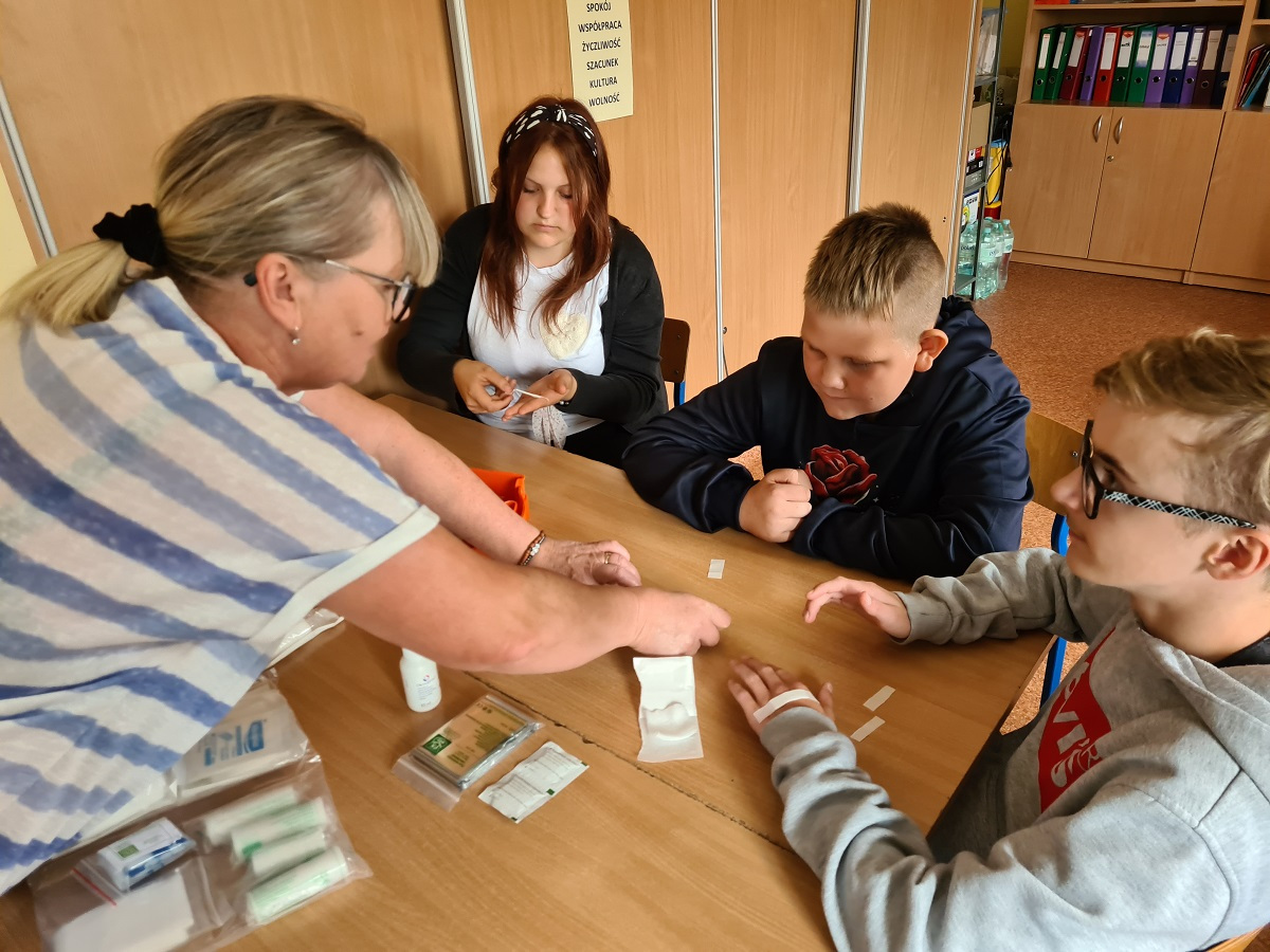W ramach zajęć funkcjonowania osobistego i społecznego, uczniowie mieli praktyczne zajęcia z pielęgniarką szkolną z wykorzystaniem apteczki pierwszej pomocy. Uczymy się dbać o bezpieczeństwo w różnych sytuacjach, pomagać sobie i innym w razie potrzeby.