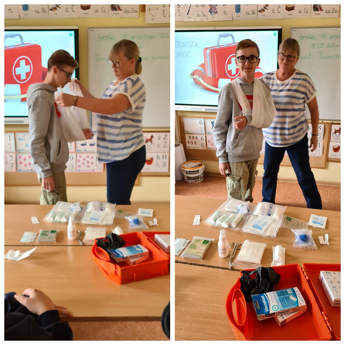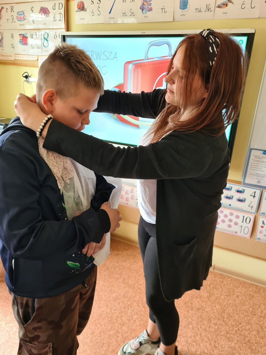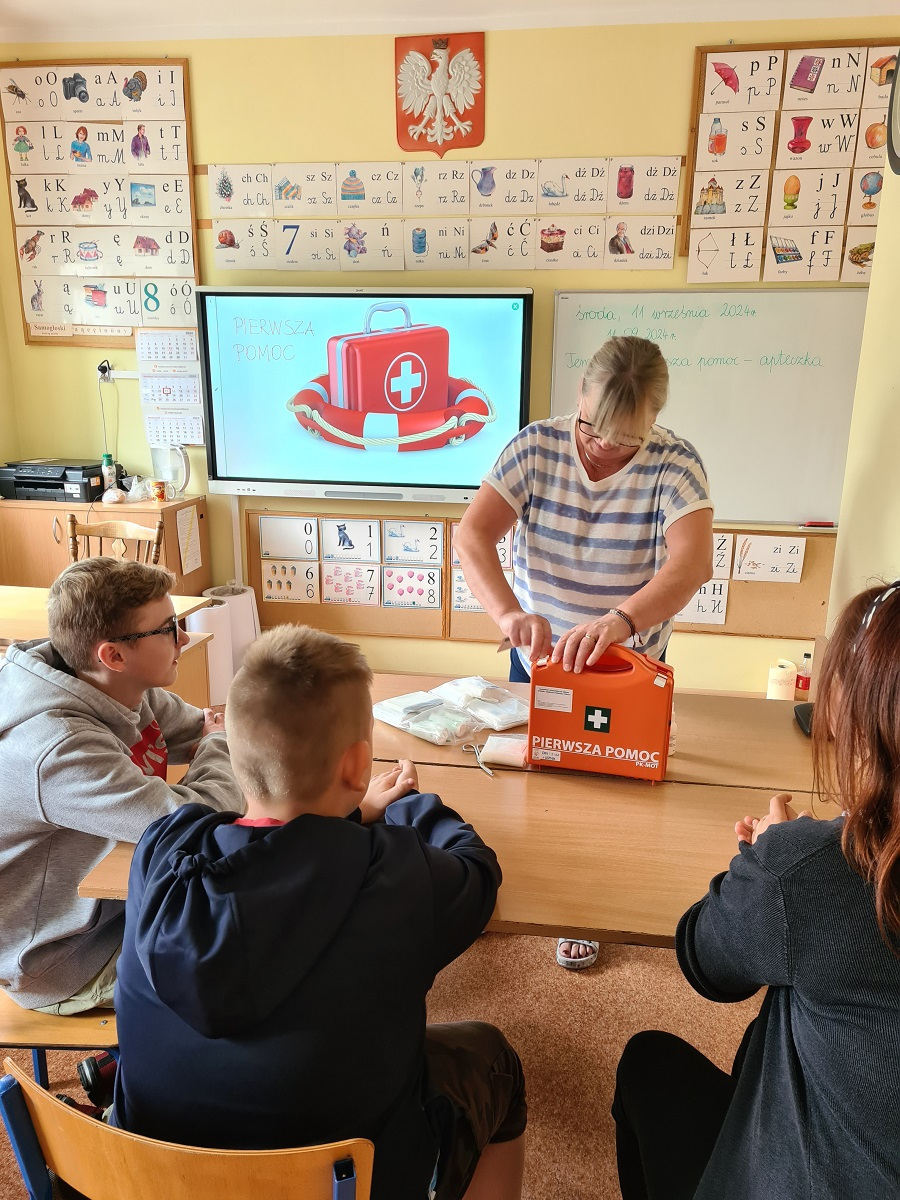 W ramach zajęć funkcjonowania osobistego i społecznego, uczniowie mieli praktyczne zajęcia z pielęgniarką szkolną z wykorzystaniem apteczki pierwszej pomocy. Uczymy się dbać o bezpieczeństwo w różnych sytuacjach, pomagać sobie i innym w razie potrzeby.