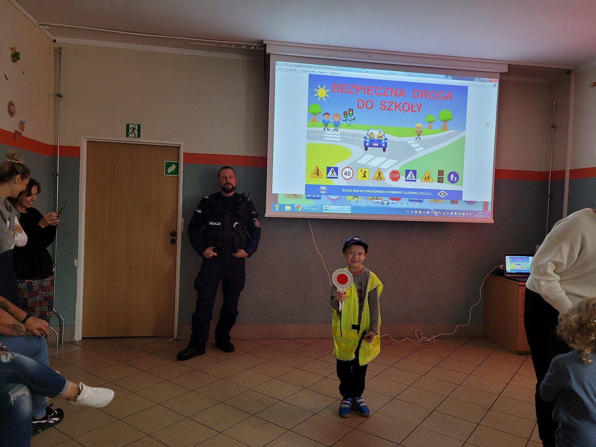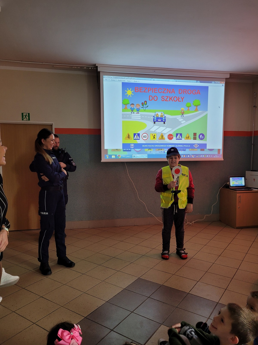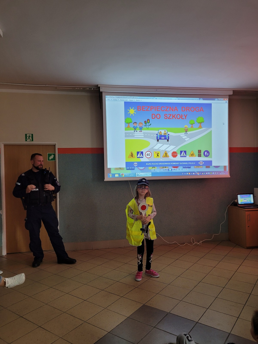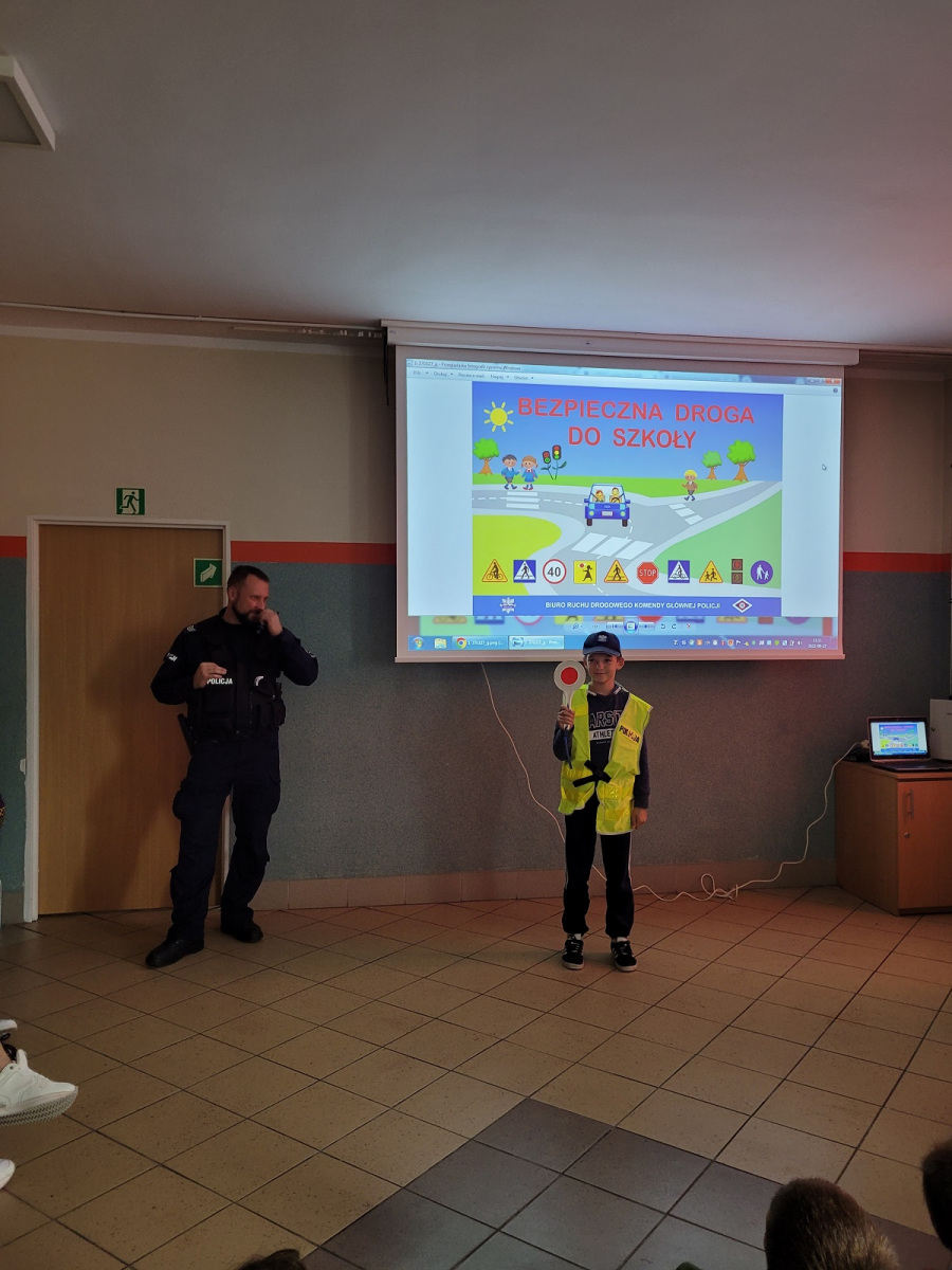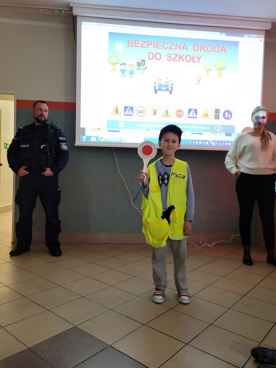 27 września 2022 r. odbyło się spotkanie z policją dotyczące bezpiecznej drogi do szkoły. Funkcjonariusze policji przypomnieli podstawowe zasady bezpiecznego poruszania się w ruchu drogowym. Uczniowie mieli okazję wejść w rolę policjanta zakładając policyjne akcesoria.
