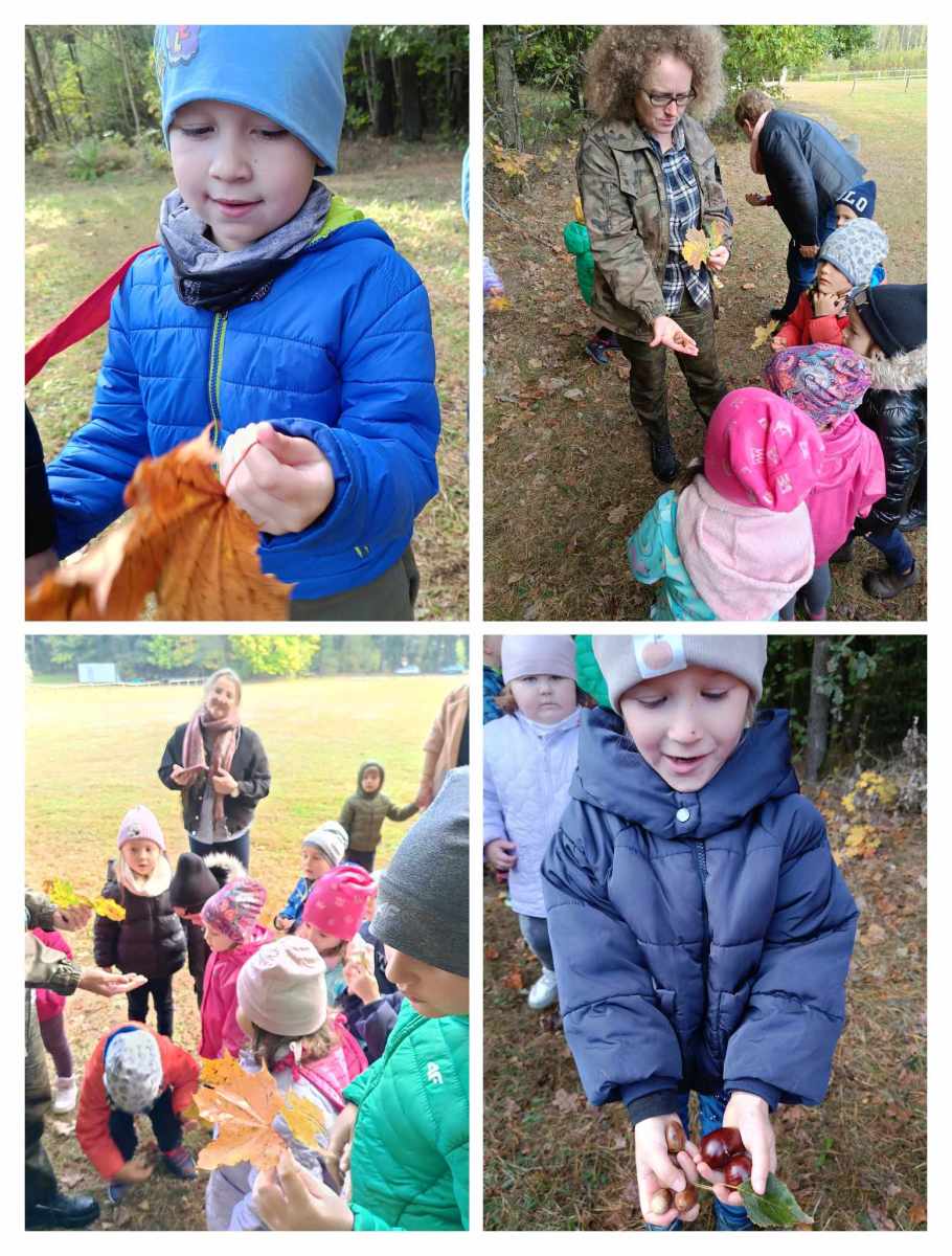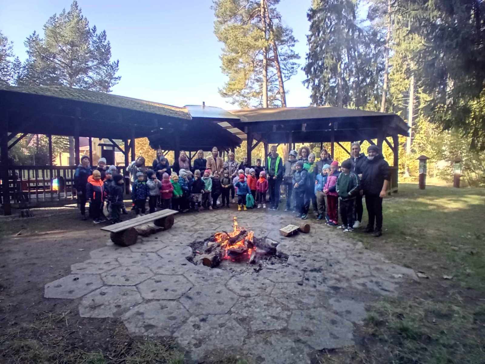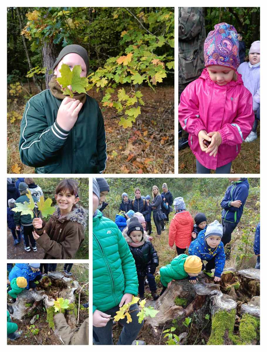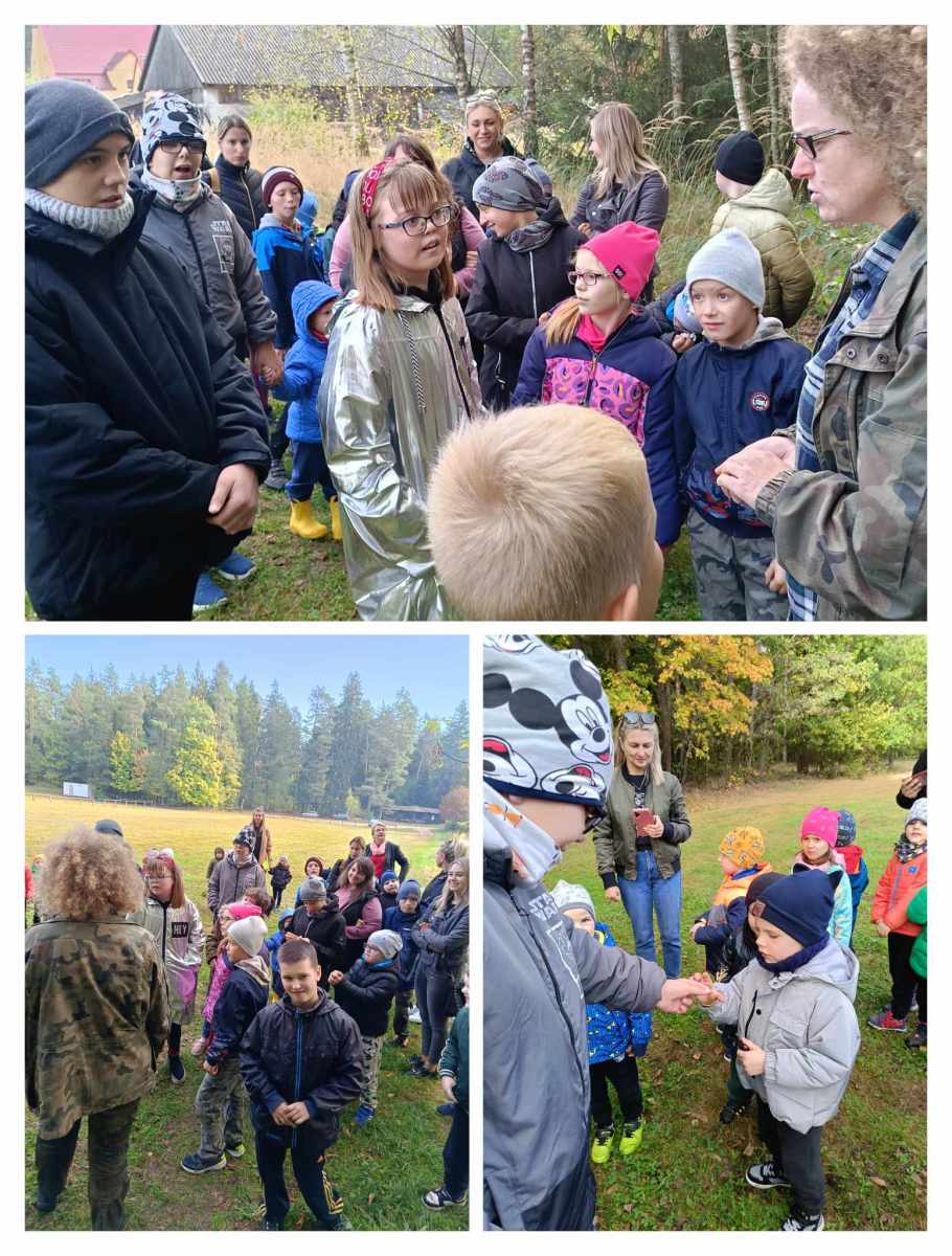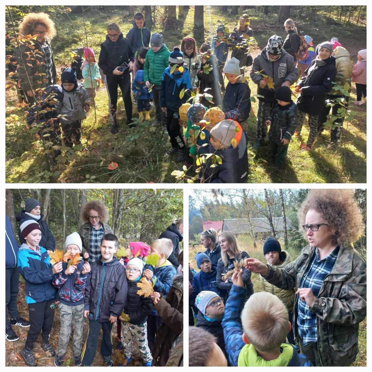 Korzystając ze sprzyjającej pogody, uczniowie naszej szkoły wraz z zaproszonymi dziećmi z Przedszkola Samorządowego nr 1 w Gołdapi wybrali się na wspólną wycieczkę do pobliskiego lasu. Na miejscu czekała na nas Pani Basia Jagłowska, z którą wyruszyliśmy na ścieżkę edukacyjną. Dzieci obserwowały przyrodę i zachodzące jesienią zmiany. Rozpoznawały różne rodzaje drzew. Zbierały kolorowe liście, kasztany, żołędzie i słuchały odgłosów lasu. Pogoda i humor wszystkim dopisały. Zajęcia zakończyły się wspólnym ogniskiem.