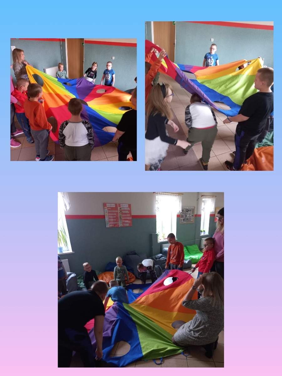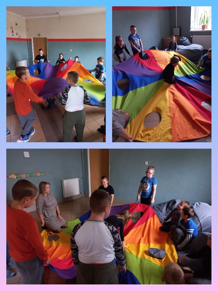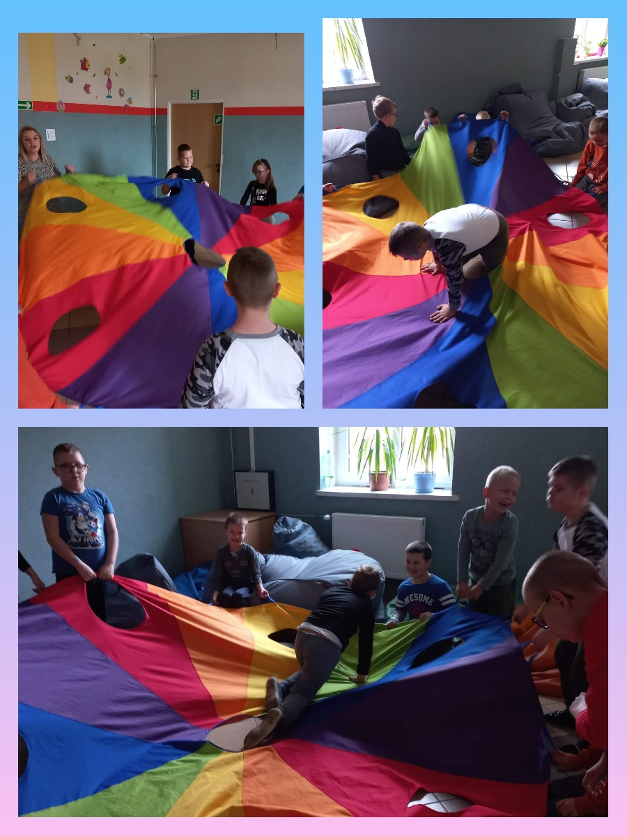 O tym, że możliwości zabaw z chustą animacyjną są praktycznie nieograniczone przekonali się ostatnio uczniowie z zespołów edukacyjno – terapeutycznych na zajęciach rozwijających kreatywność. Chusta edukacyjna zaskoczyła wszystkich swą wszechstronnością: dzieci mogły ją podrzucać, falować, chować się pod nią, tańczyć, jak również utrwalić nazwy kolorów. Była to również świetnia okazja do integracji najmłodszych grup klasowych. Uczniowie byli zachwyceni tego typu zabawą i z pewnością niejednokrotnie ją powtórzymy.