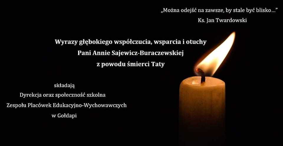 Kondolencje 10 maja 202210 maja 2022 „Można odejść na zawsze, by stale być blisko…”ks. Jan Twardowski Wyrazy głębokiego współczucia, wsparcia i otuchyPani Annie Sajewicz-Buraczewskiejz powodu śmierci Taty składają Dyrekcja oraz społeczność szkolnaZPEW w Gołdapi