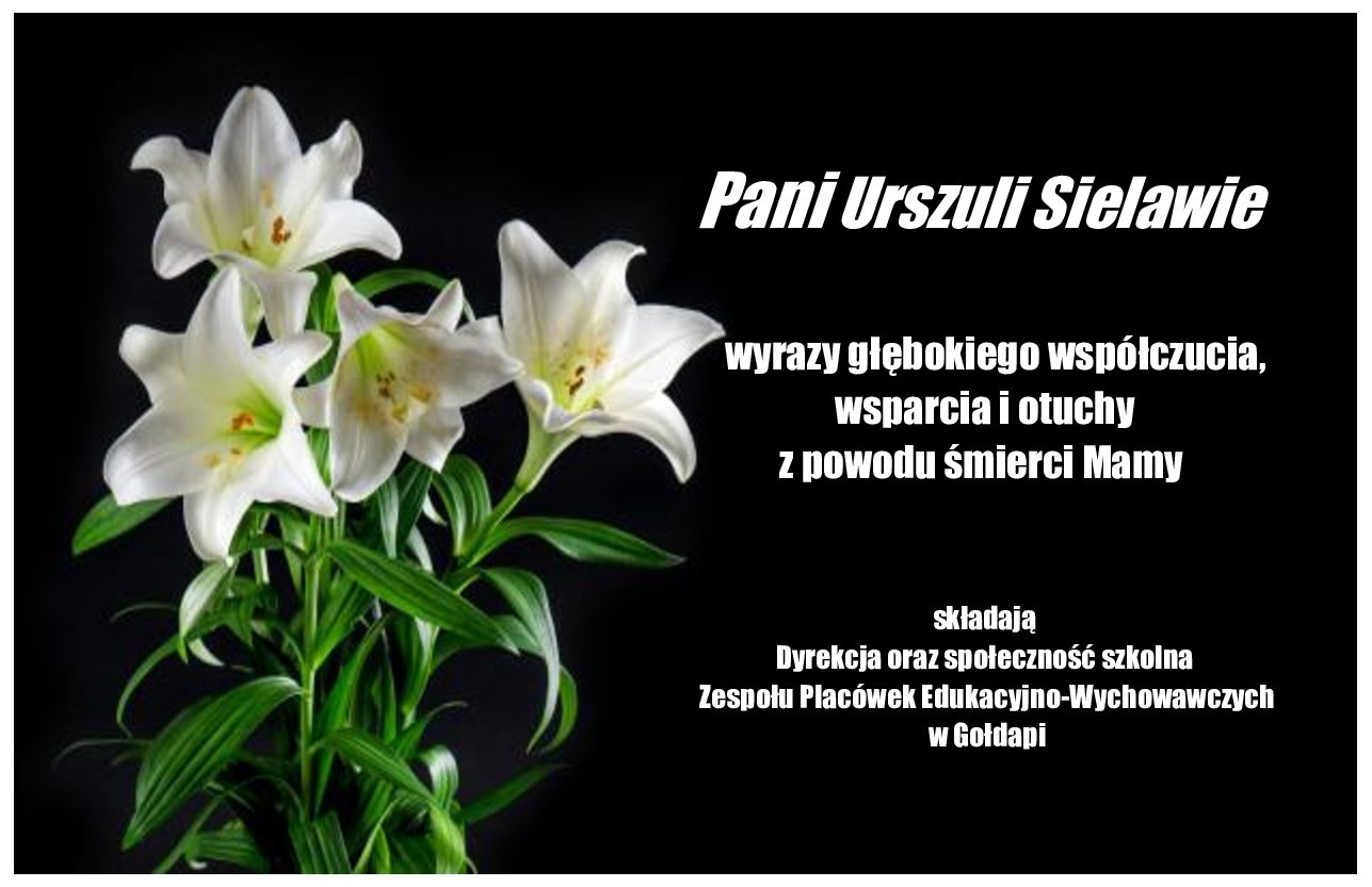 Kondolencje 7 listopada 20227 listopada 2022 Pani Urszuli Sielawie wyrazy głębokiego współczucia, wsparcia i otuchyz powodu śmierci MamyskładająDyrekcja oraz społeczność szkolna Zespołu Placówek Edukacyjno-Wychowawczych w Gołdapi