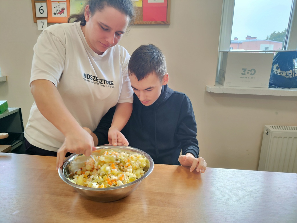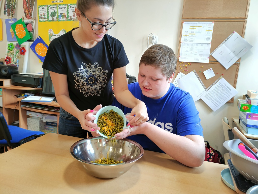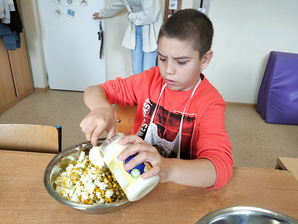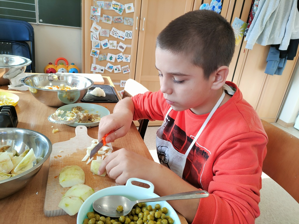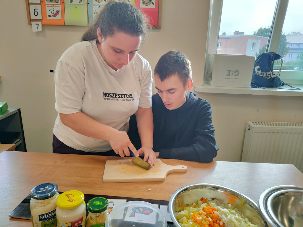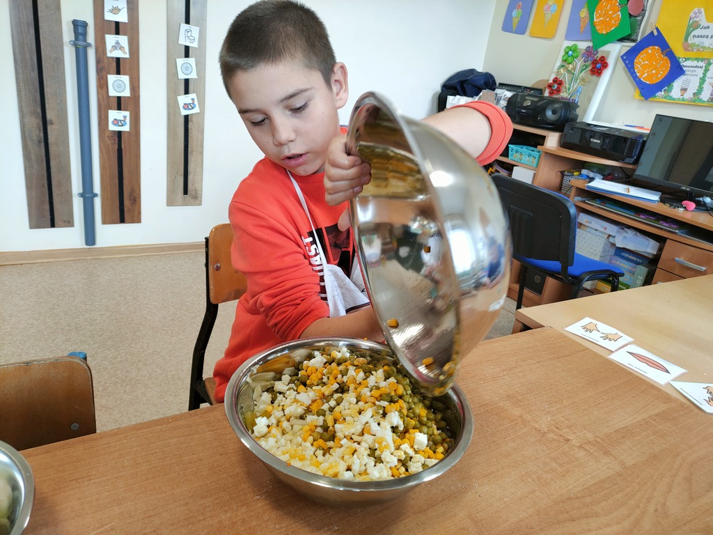 W październiku uczniowie ZET VI pod okiem p. Beaty Jurewicz, korzystając z przyborów kuchennych zakupionych w ramach programu Laboratoria Przyszłości, doskonalili umiejętności kulinarne. Uczniowie przygotowali sałatkę jarzynową i zdrowe śniadanie – płatki owsiane z jogurtem i bananem. Było praktycznie ale przede wszystkim pysznie.