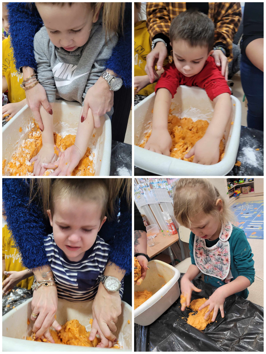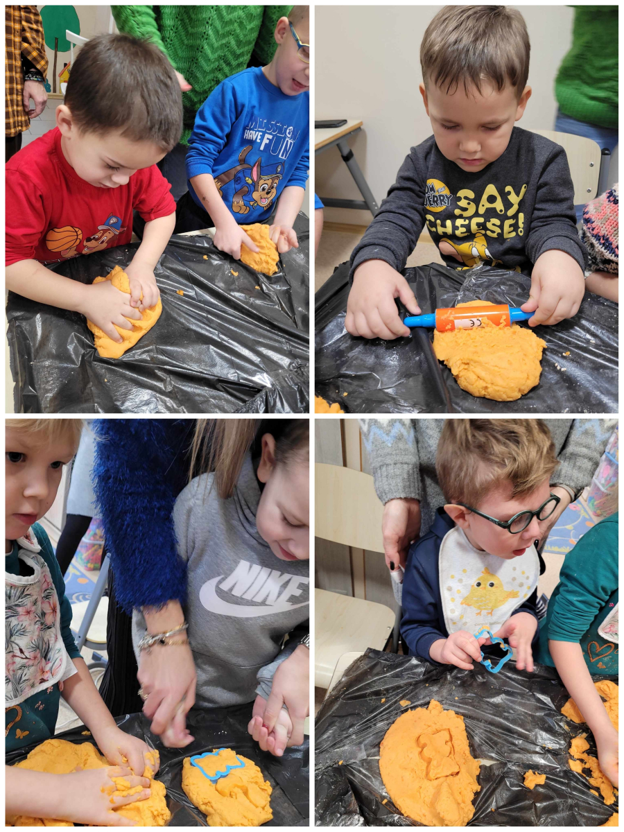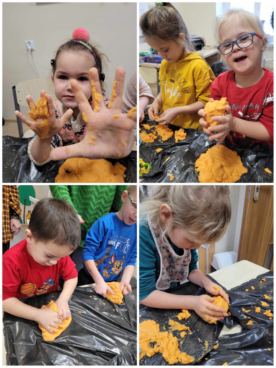 Marchewkolina czyli ekspresowa, jadalna ciastolina. Masy plastyczne dostarczają wielu doznań i oddziałują na dziecięce wyobraźnie. Przedszkolaki miały okazję poznać jej terapeutyczna moc. Dzieci lepiły, wycinały z foremek oraz wałkowały pomarańczowe ciasto.