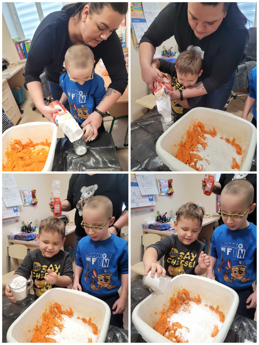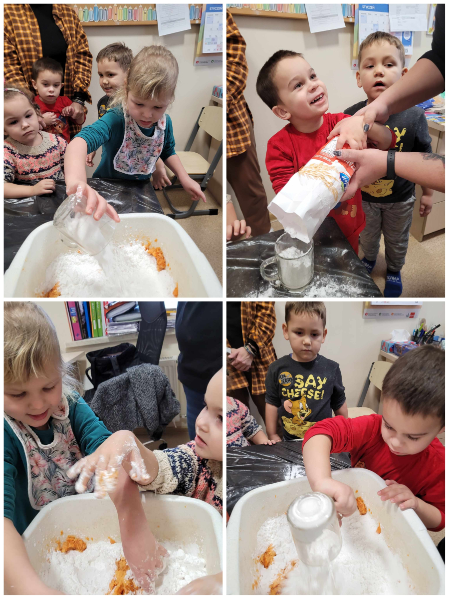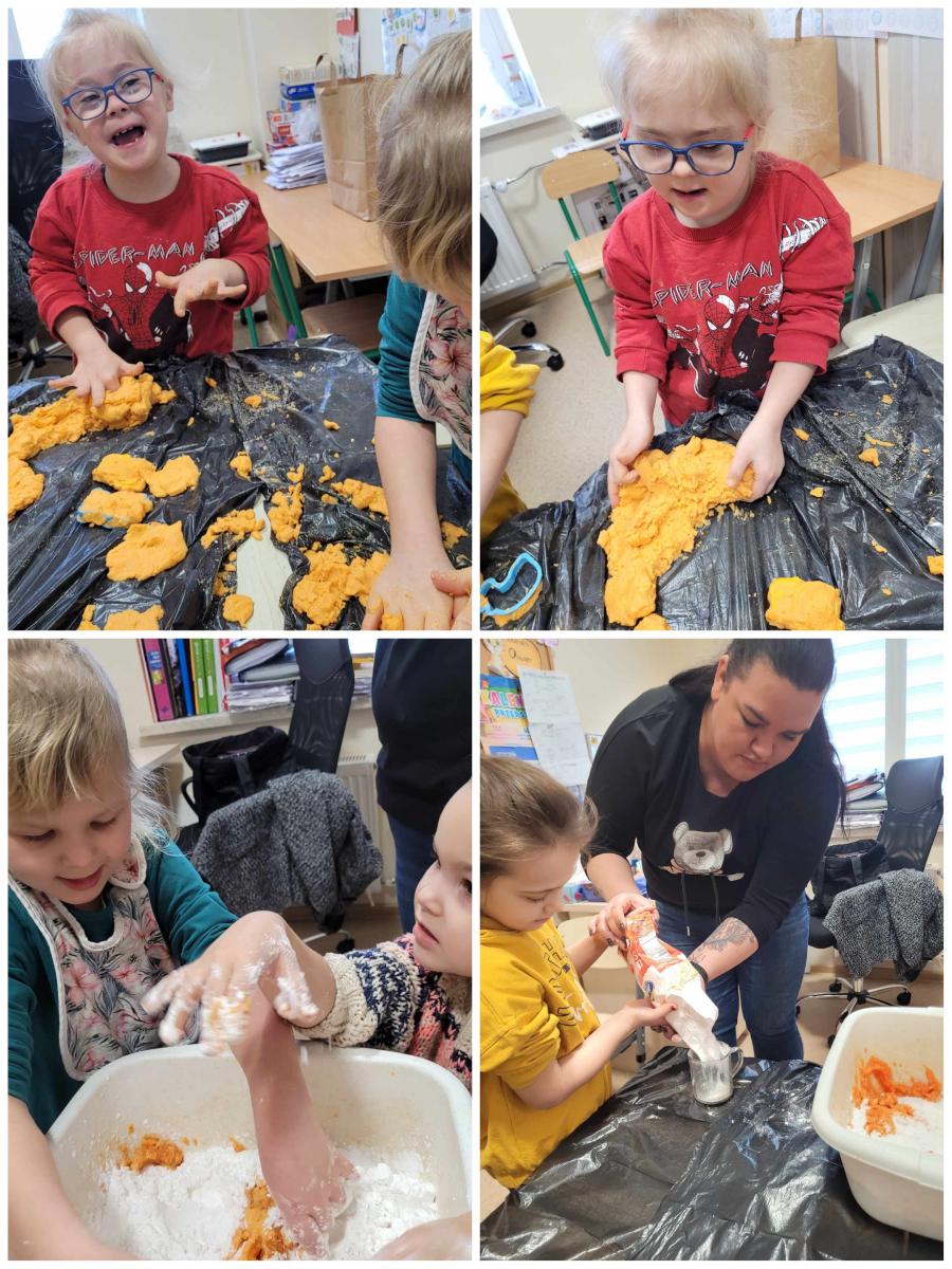 Marchewkolina czyli ekspresowa, jadalna ciastolina. Masy plastyczne dostarczają wielu doznań i oddziałują na dziecięce wyobraźnie. Przedszkolaki miały okazję poznać jej terapeutyczna moc. Dzieci lepiły, wycinały z foremek oraz wałkowały pomarańczowe ciasto.