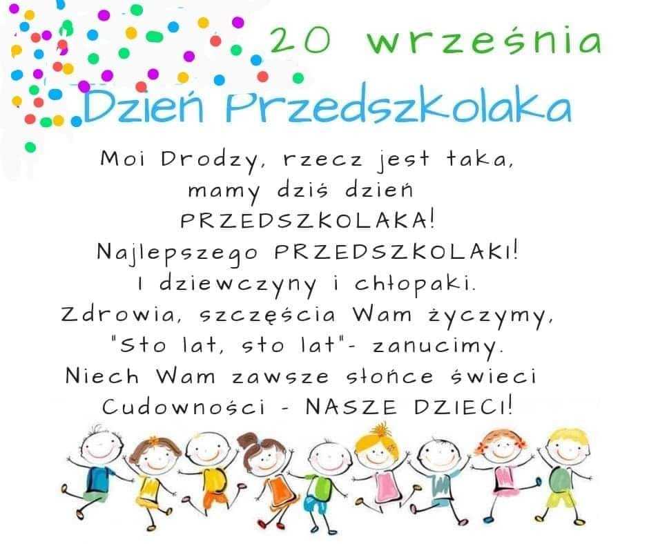 Najlepsze życzenia z okazji Dnia Przedszkolaka 20 września 2021 Z okazji Dnia Przedszkolaka, życzymy Wam drogie Dzieci, aby uśmiech zawsze gościł na waszych twarzach, każdy dzień był wspaniałą przygodą i niósł ze sobą wiele cudownych i pozytywnych doświadczeń. Niech Wasze marzenia się spełniają !!!