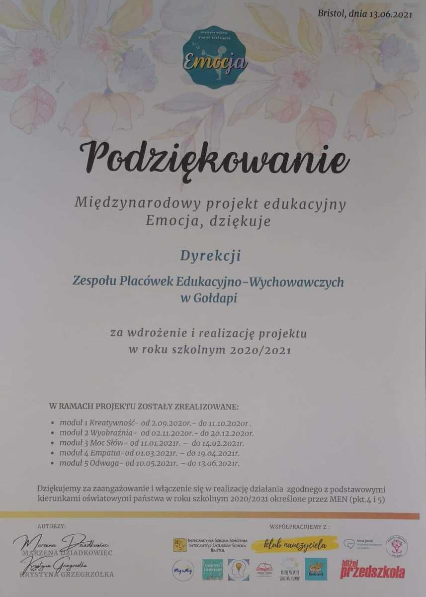 Podziękowanie! 10 czerwca 2021 Podziękowanie ZPEW w Gołdapi za wdrożenie i realizację projektu „Emocja”!