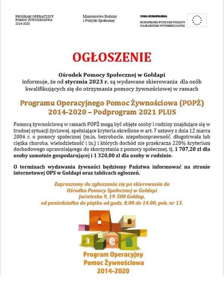 Ośrodek Pomocy Społecznej w Gołdapi wydaje skierowania dla osób kwalifikujących się do otrzymania pomocy żywnościowej w ramach PROGRAMU OPERACYJNEGO POMOC ŻYWNOŚCIOWA (POPŻ) 2014-2020 – PODPROGRAM 2021 PLUS.