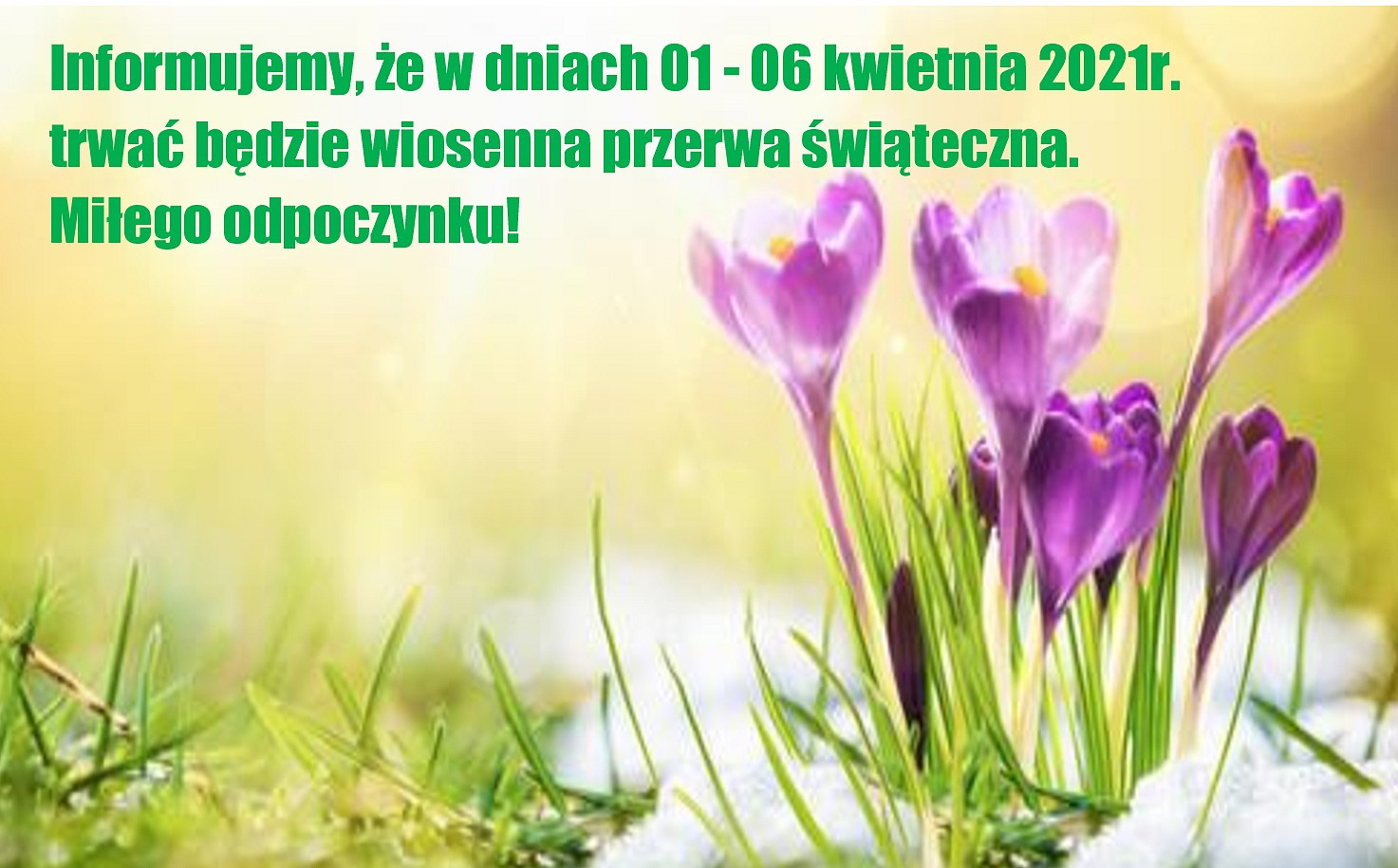 Informujemy, że w dniach 01 – 06 kwietnia 2021r. trwać będzie wiosenna przerwa świąteczna. Miłego odpoczynku!