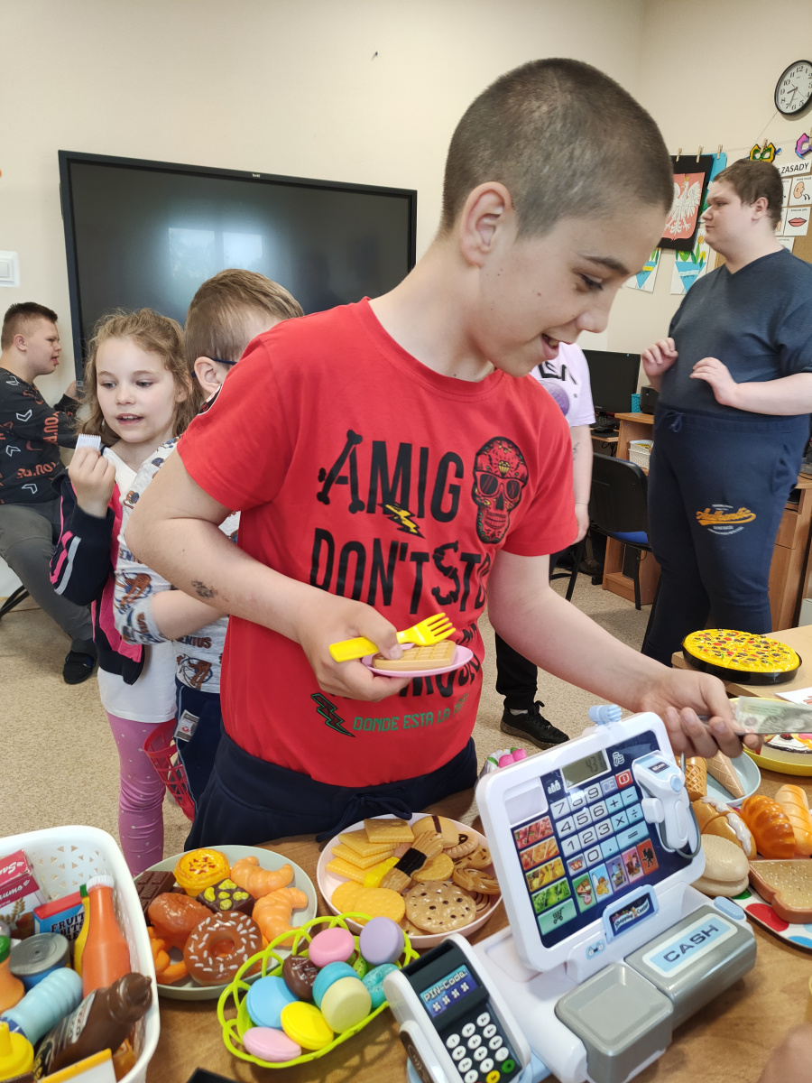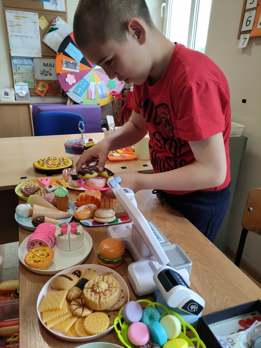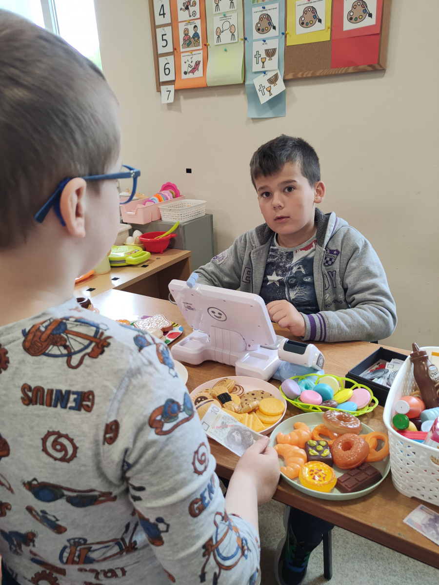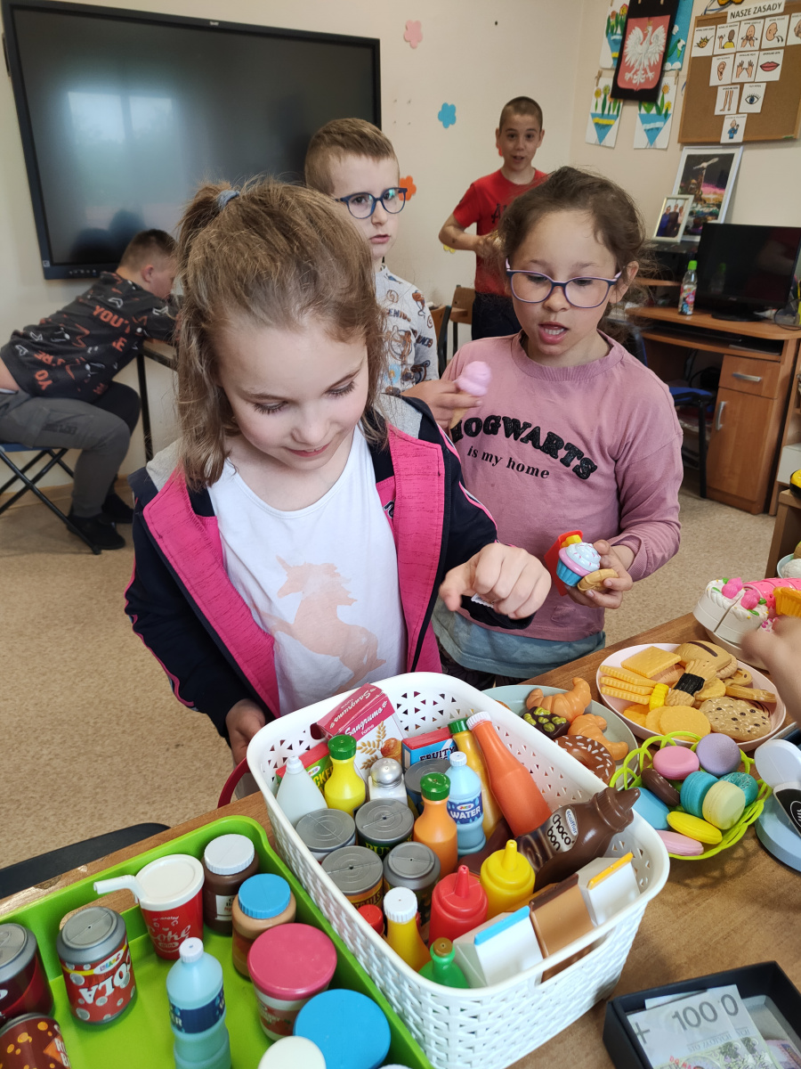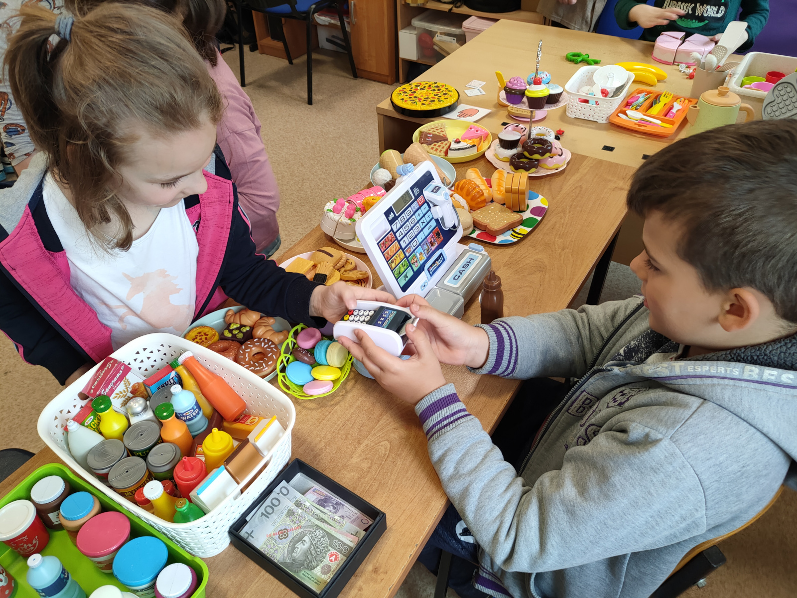 Uczniowie kl. I, II A oraz ZET I i ZET VI korzystając z bogatego asortymentu spożywczego wcielali się w rolę klienta i sprzedawcy. Uczyli się obsługiwać kasę fiskalną, terminal, formułować wypowiedzi do zaaranżowanej sytuacji, posługiwać się pieniędzmi, spokojnie wyczekiwać na swoją kolej. Aktywność ta cieszyła się ogromnym zainteresowaniem. Zabawie nie było końca… 🙂 Następnie uczniowie zdobytą wiedzę i umiejętności mieli okazję zastosować podczas zakupów w sklepie.