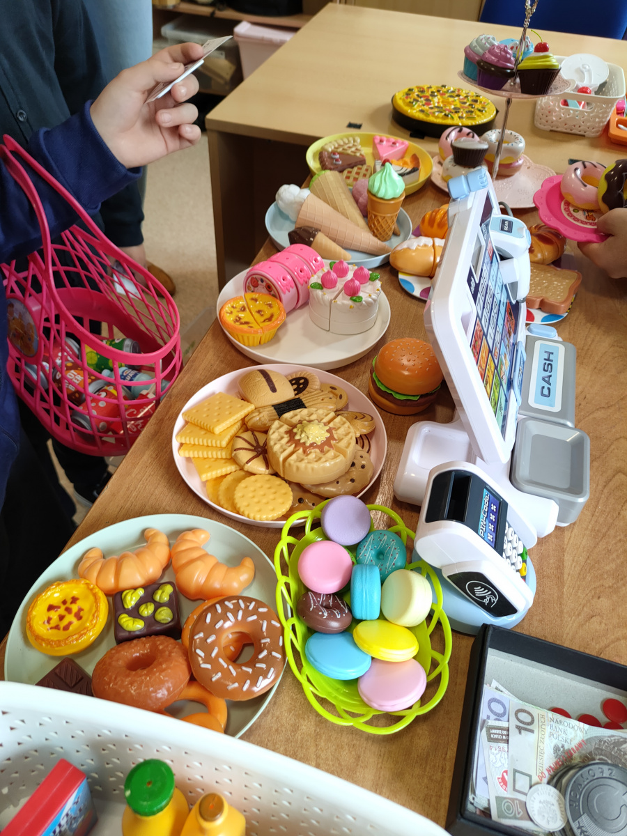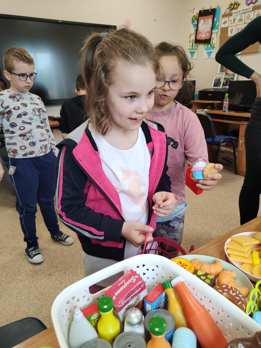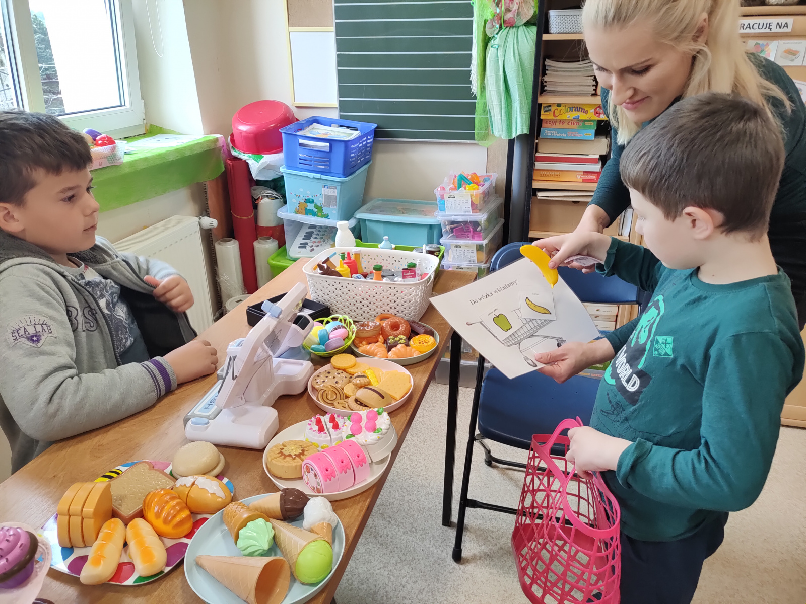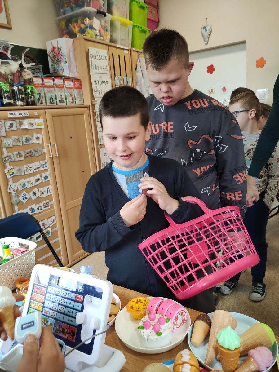 Uczniowie kl. I, II A oraz ZET I i ZET VI korzystając z bogatego asortymentu spożywczego wcielali się w rolę klienta i sprzedawcy. Uczyli się obsługiwać kasę fiskalną, terminal, formułować wypowiedzi do zaaranżowanej sytuacji, posługiwać się pieniędzmi, spokojnie wyczekiwać na swoją kolej. Aktywność ta cieszyła się ogromnym zainteresowaniem. Zabawie nie było końca… 🙂 Następnie uczniowie zdobytą wiedzę i umiejętności mieli okazję zastosować podczas zakupów w sklepie.