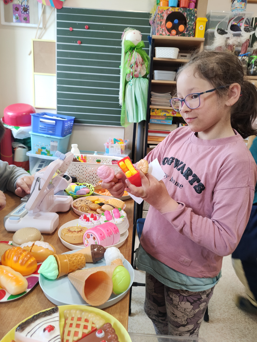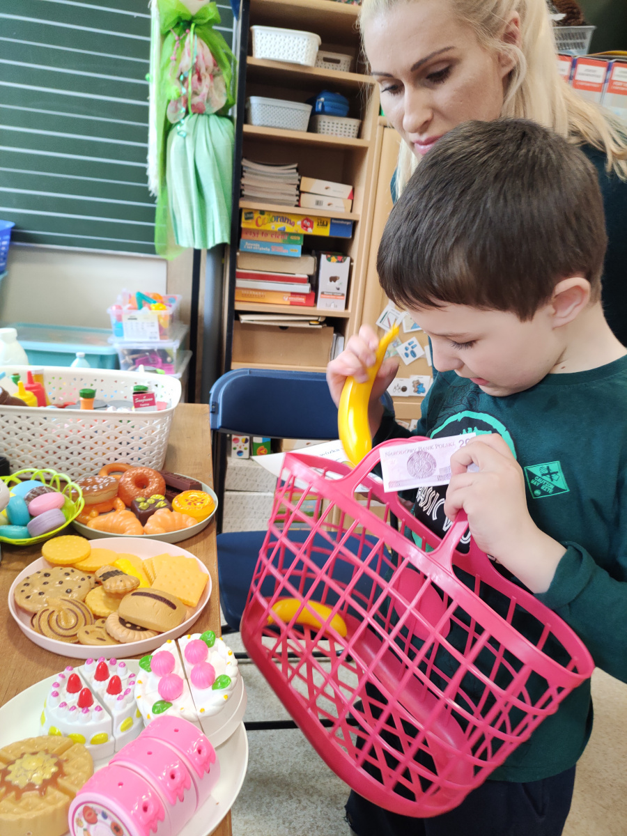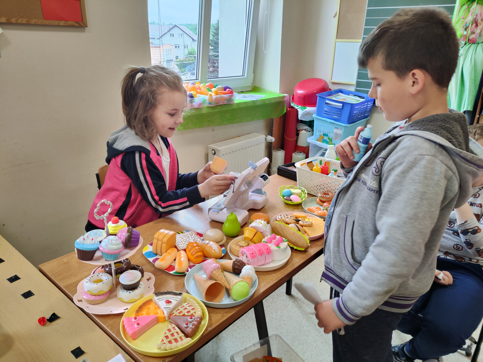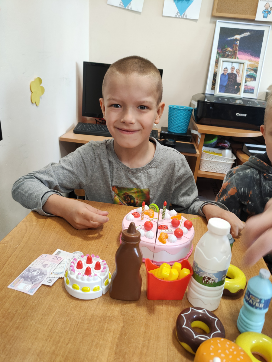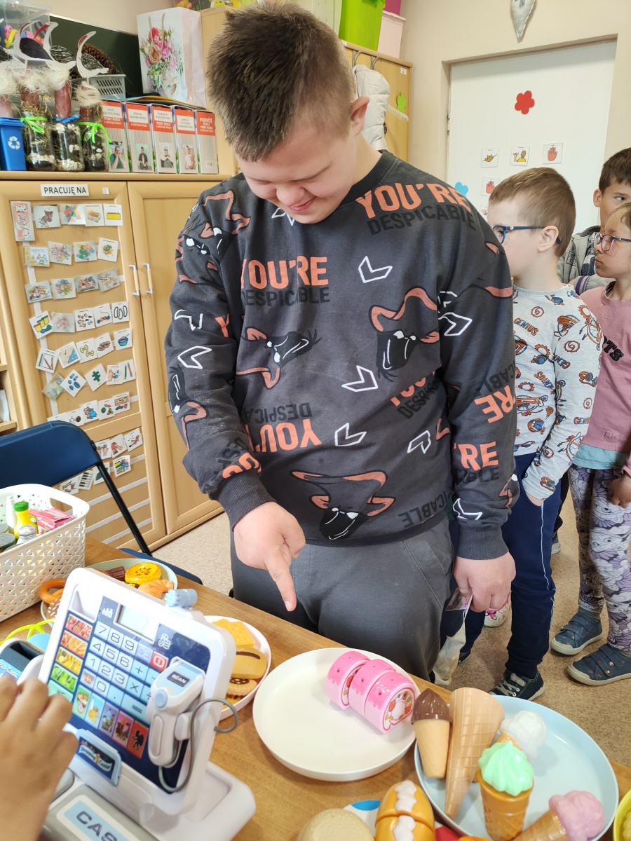 Uczniowie kl. I, II A oraz ZET I i ZET VI korzystając z bogatego asortymentu spożywczego wcielali się w rolę klienta i sprzedawcy. Uczyli się obsługiwać kasę fiskalną, terminal, formułować wypowiedzi do zaaranżowanej sytuacji, posługiwać się pieniędzmi, spokojnie wyczekiwać na swoją kolej. Aktywność ta cieszyła się ogromnym zainteresowaniem. Zabawie nie było końca… 🙂 Następnie uczniowie zdobytą wiedzę i umiejętności mieli okazję zastosować podczas zakupów w sklepie.